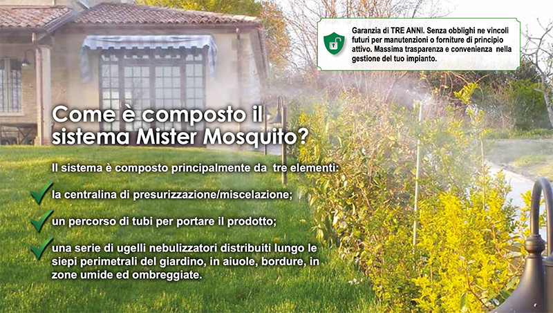 Mister Mosquito è interamente fabbricato in Italia con i migliori componenti, curato da mani esperte e professionali, e rappresenta la soluzione con il miglior rapporto qualità-prezzo sul mercato. Acquistando un impianto Mister Mosquito, non ci saranno costi aggiuntivi per la manutenzione o per l’acquisto di principio attivo, essendo un sistema semplice, efficace, facile da gestire, installare e programmare. Si tratta di un impianto professionale, che non richiede praticamente alcuna manutenzione e che appartiene totalmente all’acquirente, il quale può gestirlo come preferisce.